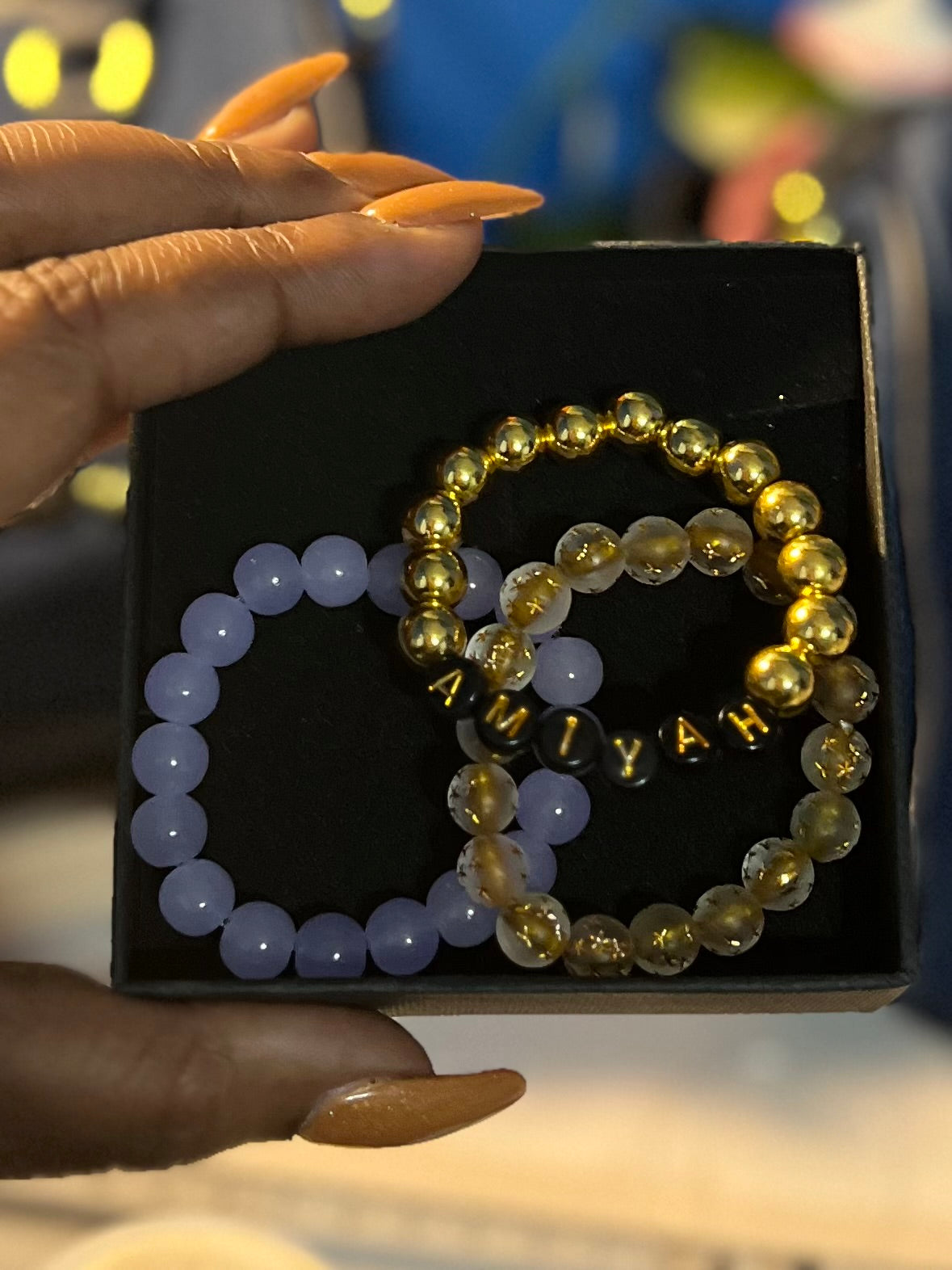 Includes 1 name bracelet and 2 beaded bracelets as pictured.